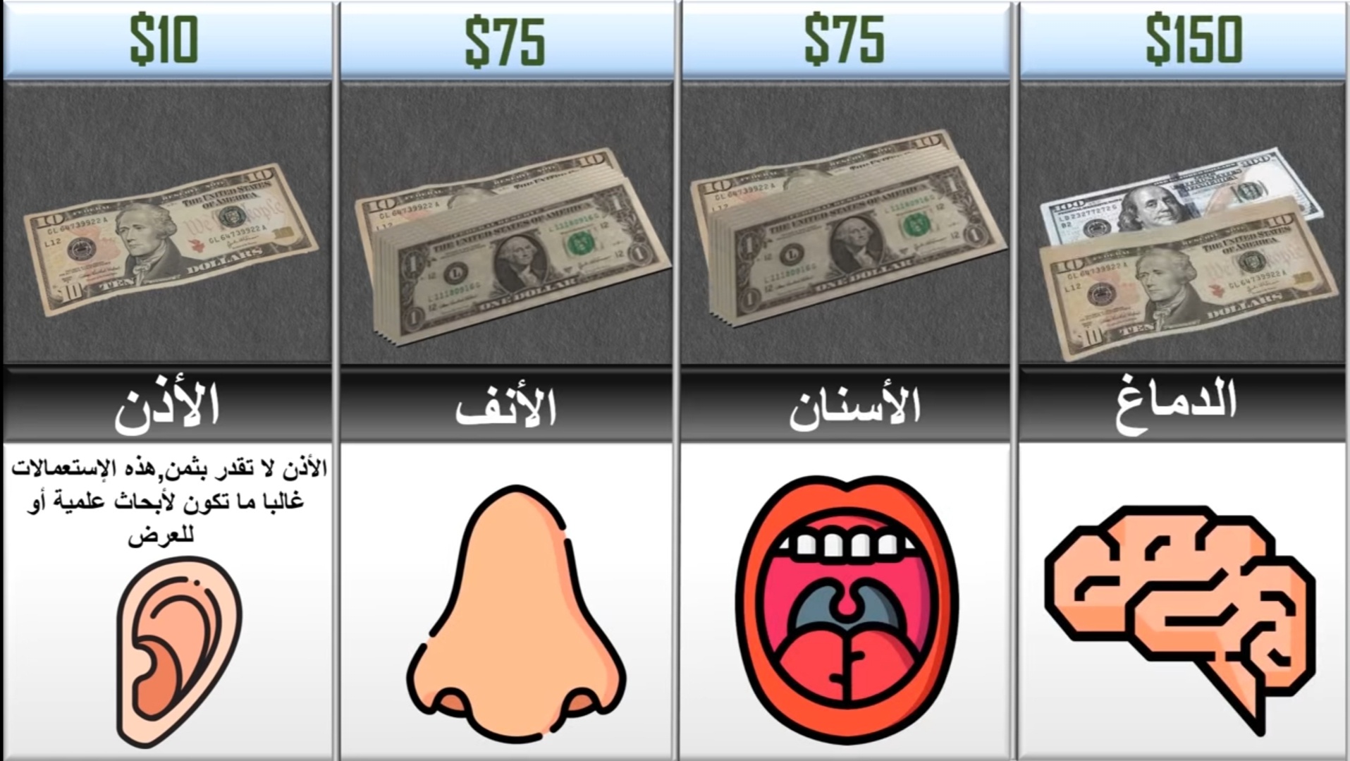 الدماغ: كنت أتصور أن الدماغ قيمته التسويقية أكثر بكثير من 150$، لكن يبدو هذا عقل إنسان لا يستعمله منذ سنين؛ على سبيل الفكاهة.