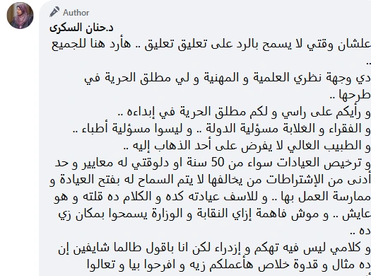 وعاودت الظهور بعد مئات الرسائل التي هاجمتها لتكتب :" علشان وقتي لا يسمح بالرد على كل تعليق.. أرد هنا للجميع ..دي وجهة نظري العلمية و المهنية و لي مطلق الحرية في طرحها ..و رأيكم على راسي و لكم مطلق الحرية في إبداءه ..و الفقراء و الغلابة مسؤولية الدولة .. و ليسوا مسؤولية أطباء ..و الطبيب الغالي لا يفرض على أحد الذهاب إليه ..و ترخيص العيادات سواء من 50 سنة او دلوقتي له معايير و حد أدنى من الاشتراطات من يخالفها لا يتم السماح له بفتح العيادة و ممارسة العمل بها .. و للأسف عيادته كده و الكلام ده قلته و هو عايش .. و موش فاهمة إزاي النقابة و الوزارة يسمحوا بمكان زي ده " .